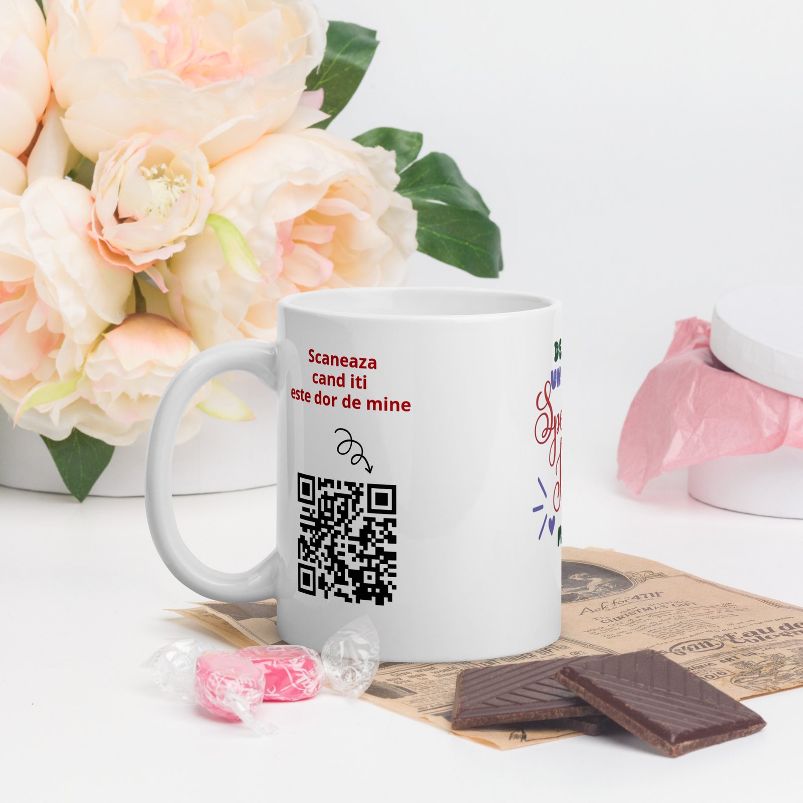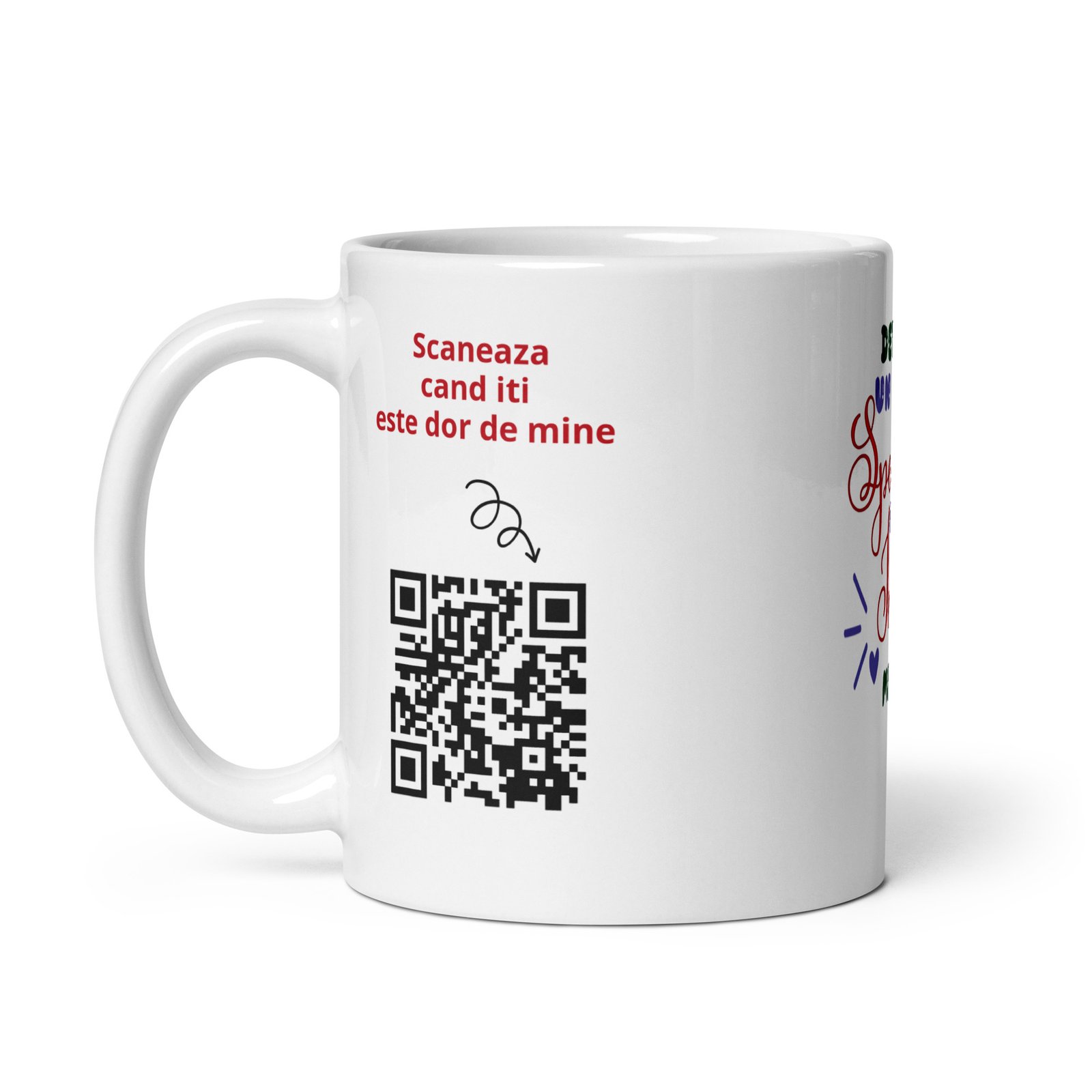 Și are un detaliu care o transformă într-o amintire cu adevărat personală: codul QR personalizabil. La scanare, persoana dragă poate descoperi exact surpriza lăsată de tine — un mesaj scris, un audio cu vocea ta sau chiar un video. E genul de cadou care nu se consumă într-o zi. Se repetă, de fiecare dată când cana e folosită.