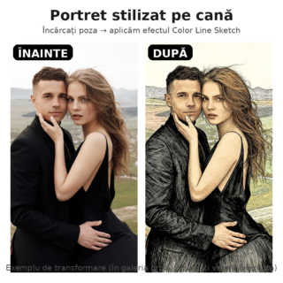 Cana Portret Stilizat – Color Line Sketch este cadoul perfect pentru cupluri (și nu numai): o poză simplă devine un portret cu efect de schiță colorată, elegant, modern și foarte „wow” la imprimare. Tu încarci fotografia, iar noi aplicam efectul Color Line Sketch și pregătim designul pentru print.