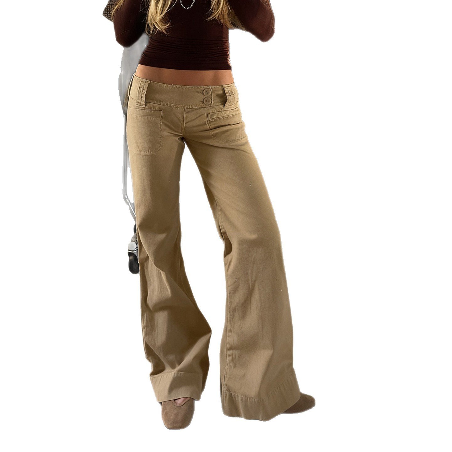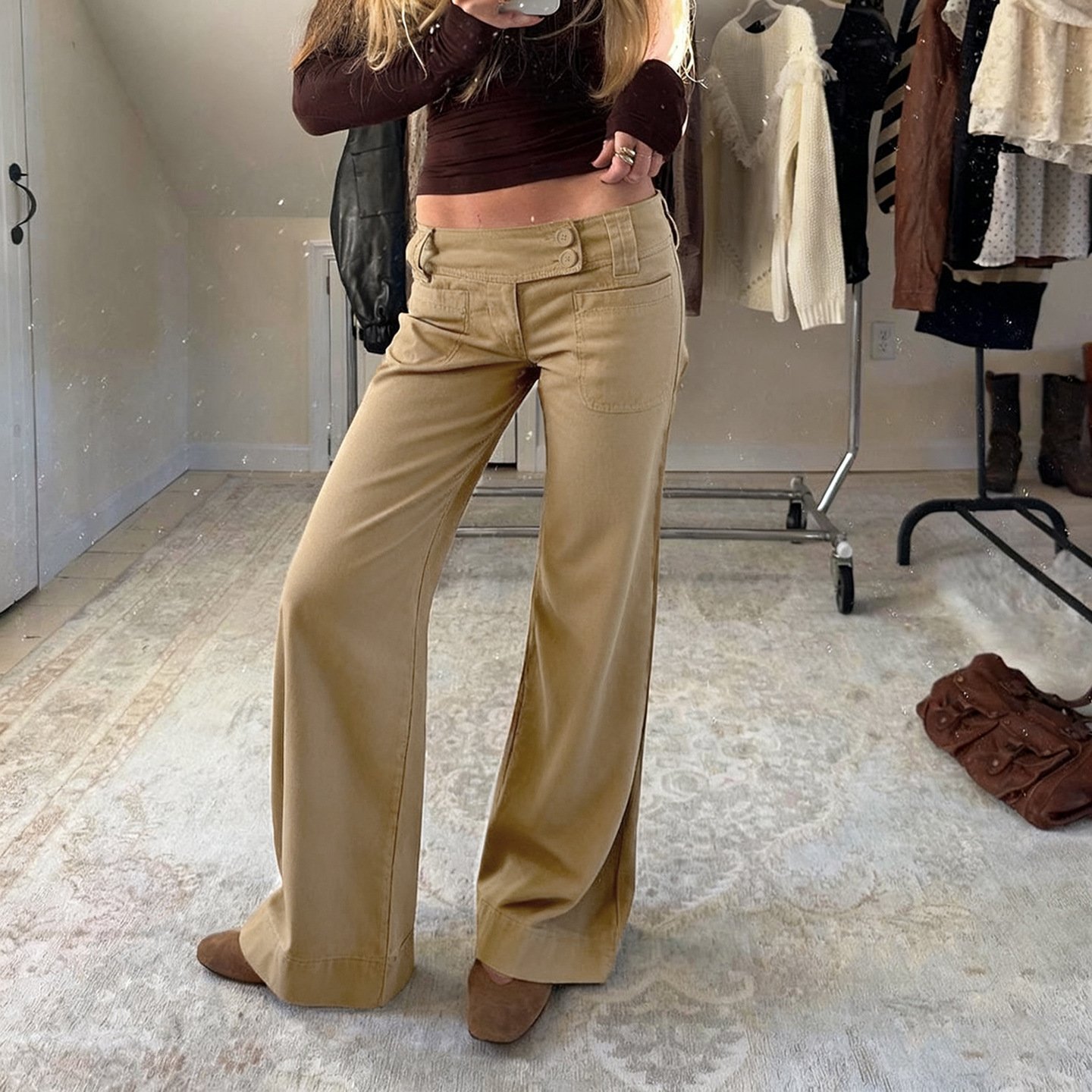 Pantaloni evazați cu talie joasă din denim kaki pentru femei