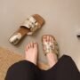 Ridicați-vă stilul de vară cu aceste sandale elegante cu toc plat și bloc pentru femei. Concepute cu o parte superioară țesută la modă și o siluetă elegantă cu o singură baretă, aceste sandale pentru exterior îmbină confortul natural cu eleganța atemporală. Designul practic, fără slip-on, le face ideale pentru ieșiri zilnice, stil casual și ținute versatile de zi cu zi, adăugând o notă de modă modernă garderobei tale.