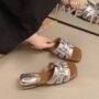 Tip călcâi : Toc plat, blocat, pentru susținere stabilă și purtare confortabilă pe tot parcursul zilei. Formă deget : Vârf deschis pentru o estetică modernă, respirabilă. Închidere : Design slip-on, ușor de încălțat și descălțat. Stil : Țesut, la modă, versatil, elegant Culoare : Auriu, negru, bej, argintiu Înălțimea tocului : Aprox. 0-3 cm (ridicare subtilă, confortabilă pentru purtare zilnică) Talpă : Talpă antiderapantă din cauciuc pentru stabilitate și durabilitate.