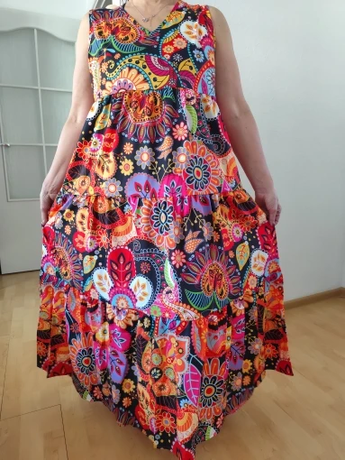 Design cu imprimeu retroCu un imprimeu retro vibrant, această rochie adaugă o notă de farmec vintage garderobei tale casual.Lungime până la jumătatea gambeiLungimea până la jumătatea gambei oferă acoperire și eleganță, perfectă pentru ocaziile de primăvară/vară.Decolteu în V și stil fără mâneciDecolteul în V și designul fără mâneci oferă o croială confortabilă, adăugând în același timp o notă elegantă.Material din poliester neelasticConfecționată din poliester neelastic, această rochie asigură durabilitate și își menține forma.Siluetă subțire în linie ASilueta în linie A a acestei rochii îți accentuează silueta, creând un efect de subțiere.